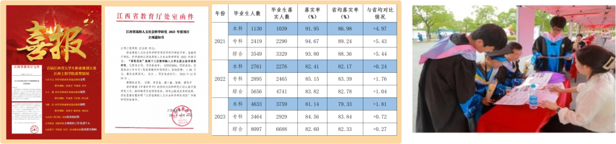 2024年,学校共举办大型招聘会3场、各类专场招聘会80余场。深入开展书记校长访企拓岗促就业专项行动,共走访企业342家,为毕业生拓宽就业岗位3703个、拓宽实习岗位864个。第一个率先在新余市高校中建立了“5+2”就业之家。2024届毕业生3613人,截止2024年8月31日,已就业3072人,全校就业率为85.03%,本科就业率为83.06%,专科就业率为89.29%。总体毕业去向落实率、本科毕业去向落实率、专科毕业去向落实 率三项数据连续三年高于全省平均水平。