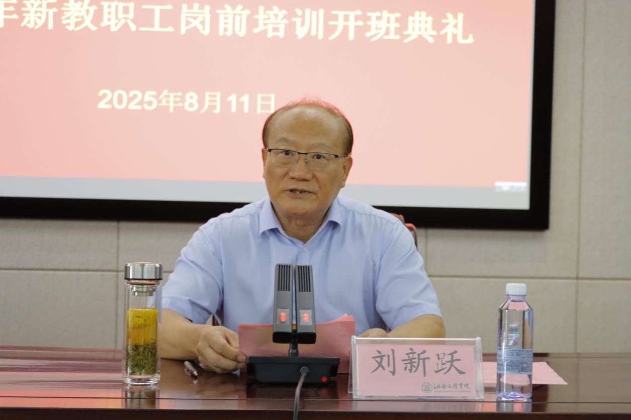 8月11日,学校2025年新入职教职工岗前培训开班仪式在天工校区行政楼三楼举行。校党委副书记、校长刘新跃出席开班仪式并讲话,党委委员、副校长黄海军出席会议,会议由黄海军主持。