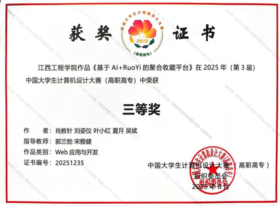 8月3日至6日,2025年(第三届)中国大学生计算机设计大赛全国总决赛在上海市圆满举行,经过四天紧张而激烈的角逐,我校人工智能与数据科学学院参赛团队凭借卓越表现,在Web应用与开发(软件应用与开发)赛中勇夺全国三等奖。